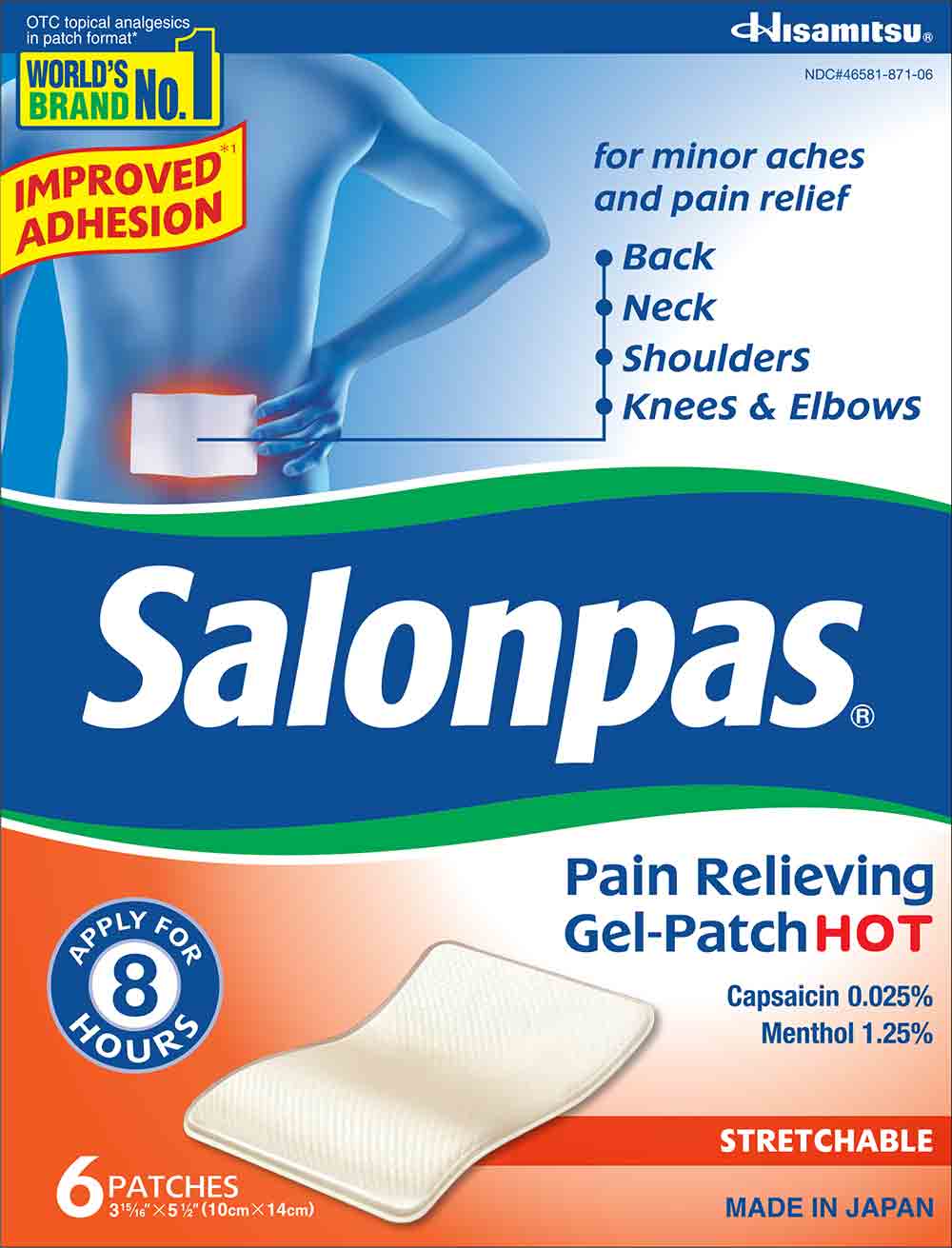 Identified as the world’s #1 brand of OTC topical analgesic patches, Salonpas® pain relieving products offer powerful, long-lasting relief of Arthritis, Back, joint and muscle pains. Salonpas® products also come in other forms including gel, spray, cream and roll-on. Please review the information below to find the best Salonpas® product for your pain.
