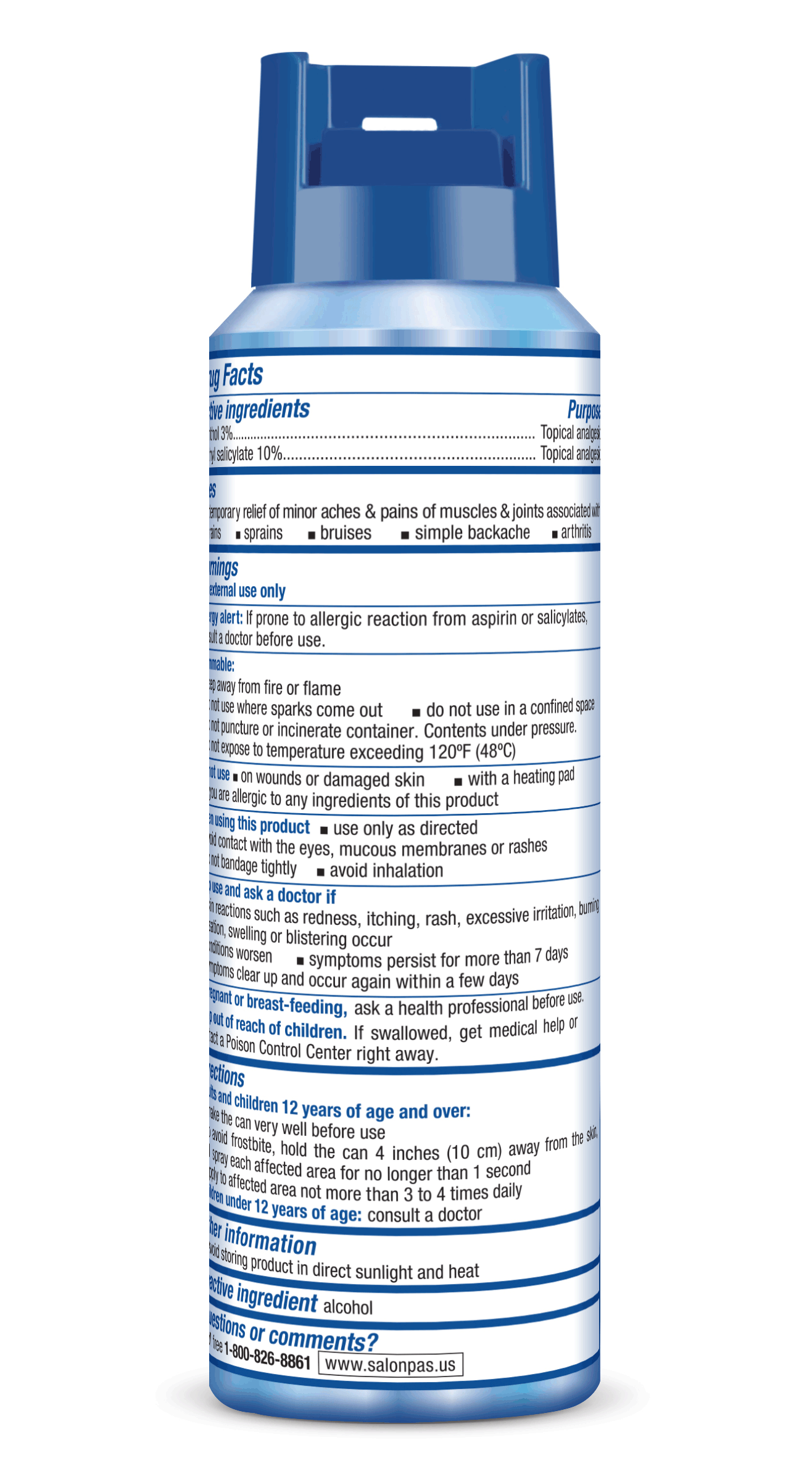 Salonpas® JET SPRAY® provides cool, fast relief of muscle and joint pain. The convenient spray contains Menthol and Methyl Salicylate and is a non-drip, quick-drying formula. Just point and shoot on still joints such as arms, hands, legs and feet to provide relief for up to 8 hours.