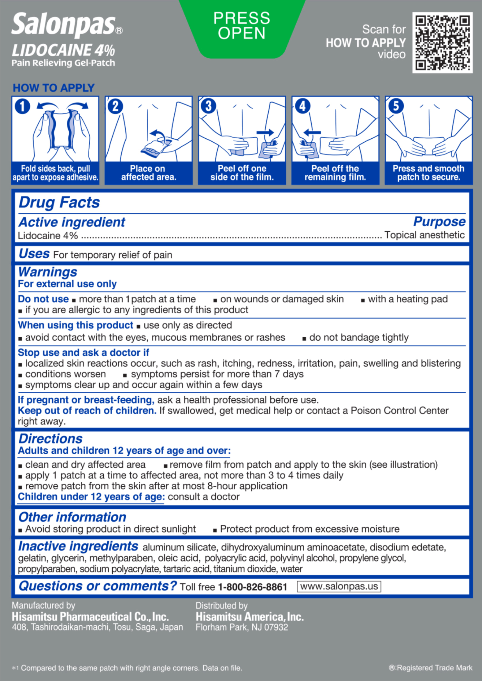 The Salonpas® LIDOCAINE Pain Relieving Gel-Patch uses hydro-gel based technology and maximum strength Lidocaine available without a prescription to provide numbing relief. The Salonpas® LIDOCAINE Pain Relieving Gel-Patch provides temporary relief of pain associated with back, neck, shoulders, knees and elbows. Please note that Salonpas® LIDOCAINE Pain Relieving Gel-Patch is not indicated for post-herpetic neuralgia.